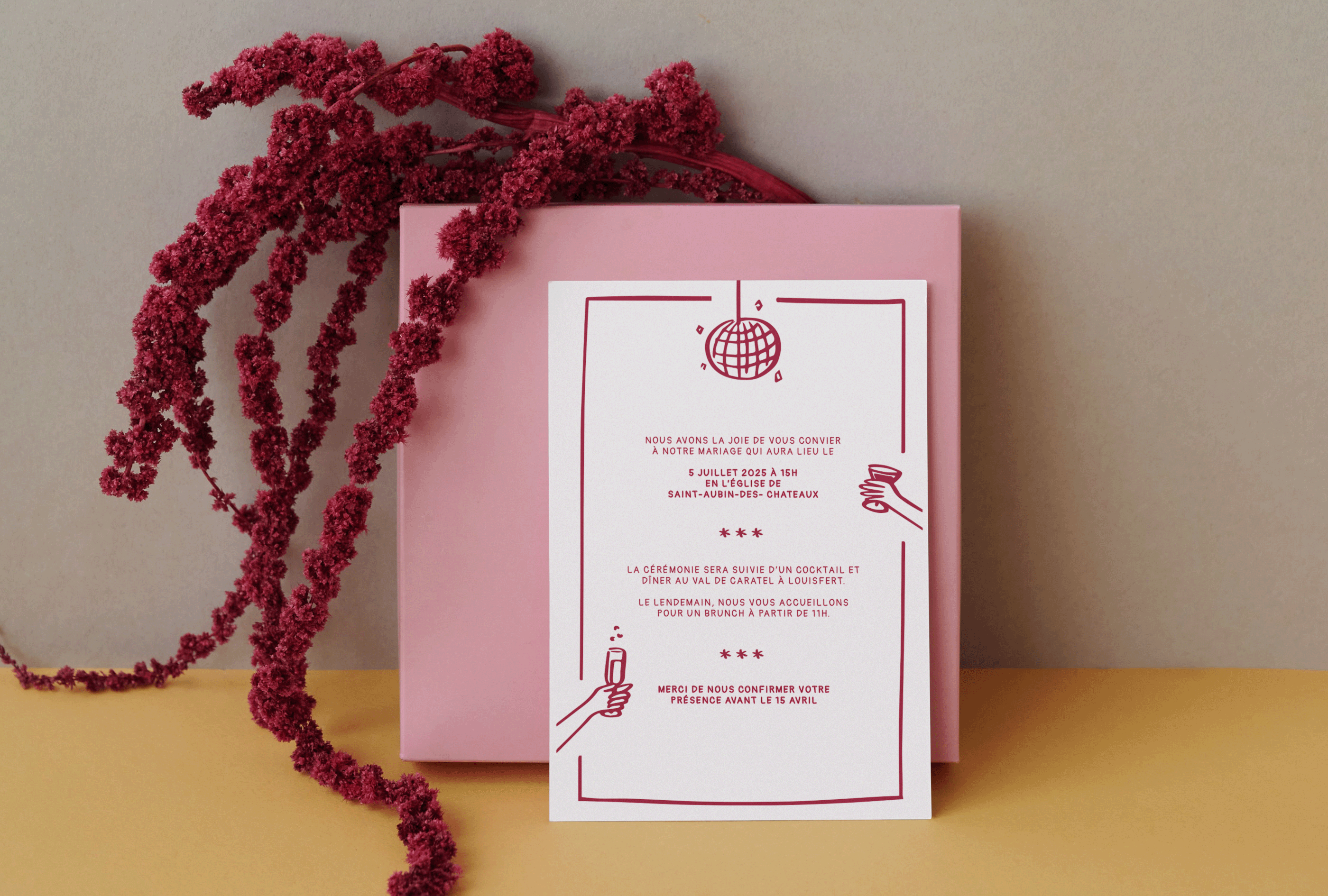 Ce projet présente un kit d’éléments visuels conçu pour un mariage à l’esprit authentique et chaleureux. Inspiré par le souhait des mariés d’une célébration décontractée et conviviale, j’ai décliné une illustration au style naïf sur différents supports. Composé d’un faire-part, menu, plan de table, numérotation et étiquettes pour des bouteilles, ce kit crée une atmosphère accueillante et festive.