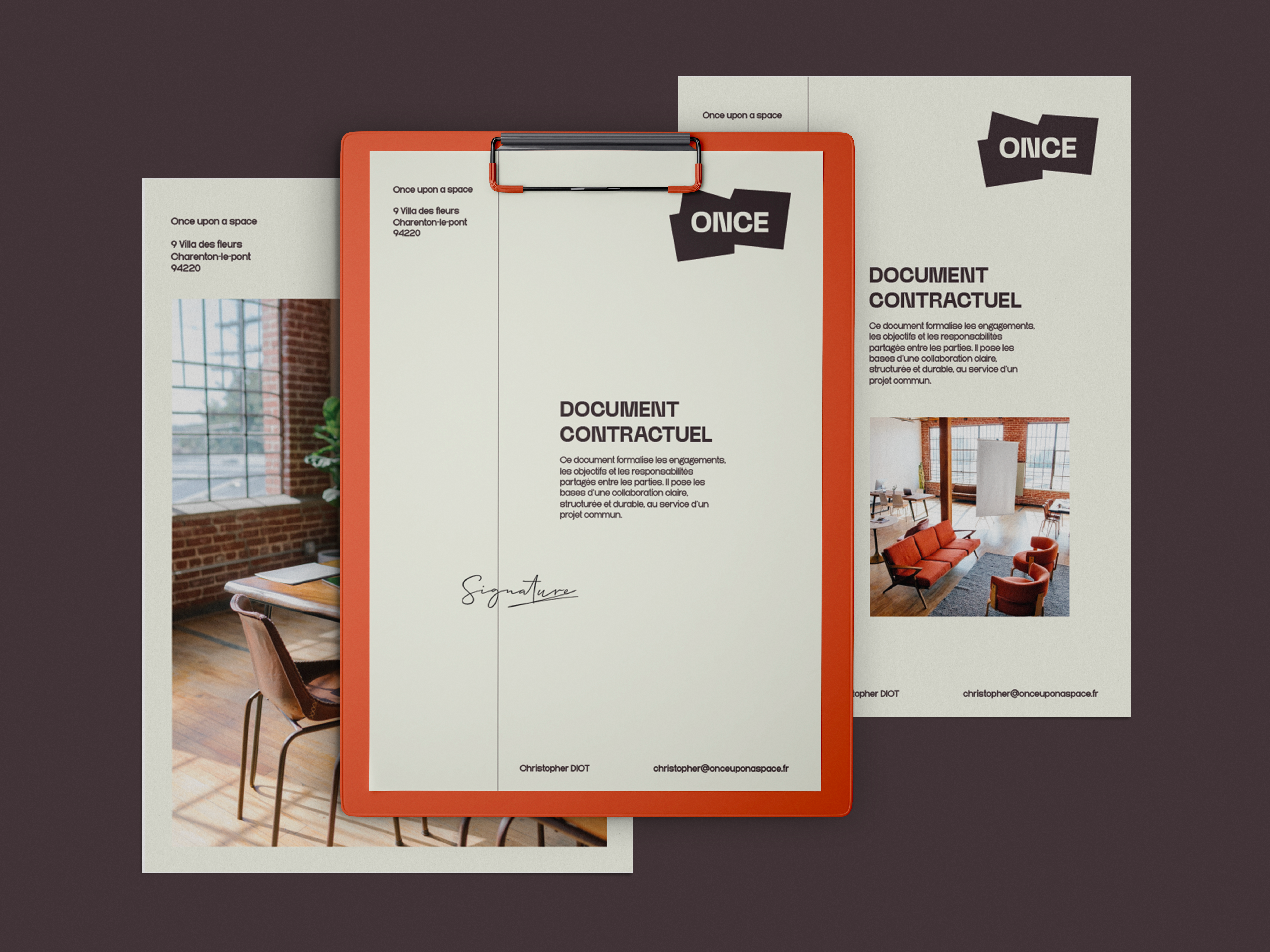 Rebranding complet pour Once, une entreprise spécialisée dans la conception et l’aménagement d’espaces de travail. L’identité visuelle s’inspire des codes des plans d’architectes : grilles apparentes, annotations manuscrites et croquis, pour refléter l’approche structurée et humaine de leurs projets. Un univers graphique pensé pour traduire leur expertise, tout en apportant clarté et modernité à la marque.